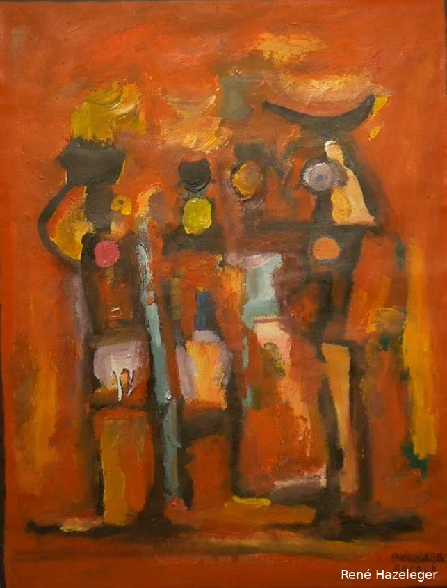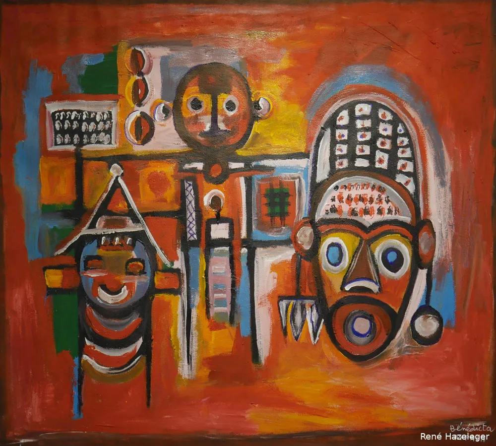 Zeer expresief zijn enkele doeken waarin warme oker- en roodtinten domineren, met fragmentarische lijnen die vaag silhouetten suggereren. Door de expressieve penseelvoering ontstaat een gevoel van beweging en herinnering — alsof het schilderij zelf fluistert over de geluiden en geuren van haar geboortestad. De samenhang van kleur en structuur roept een nostalgische en tegelijkertijd levendige sfeer op. Dit werk belichaamt Bénédicta’s verbondenheid met haar Afrikaanse oorsprong en haar kijk op herinnering als iets levends dat altijd opnieuw gevormd wordt.